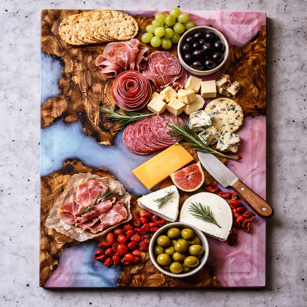 Epoxy Board Ice Blue und Rosa – Handgefertigtes Schneidebrett aus Olivenholz mit Epoxidharz