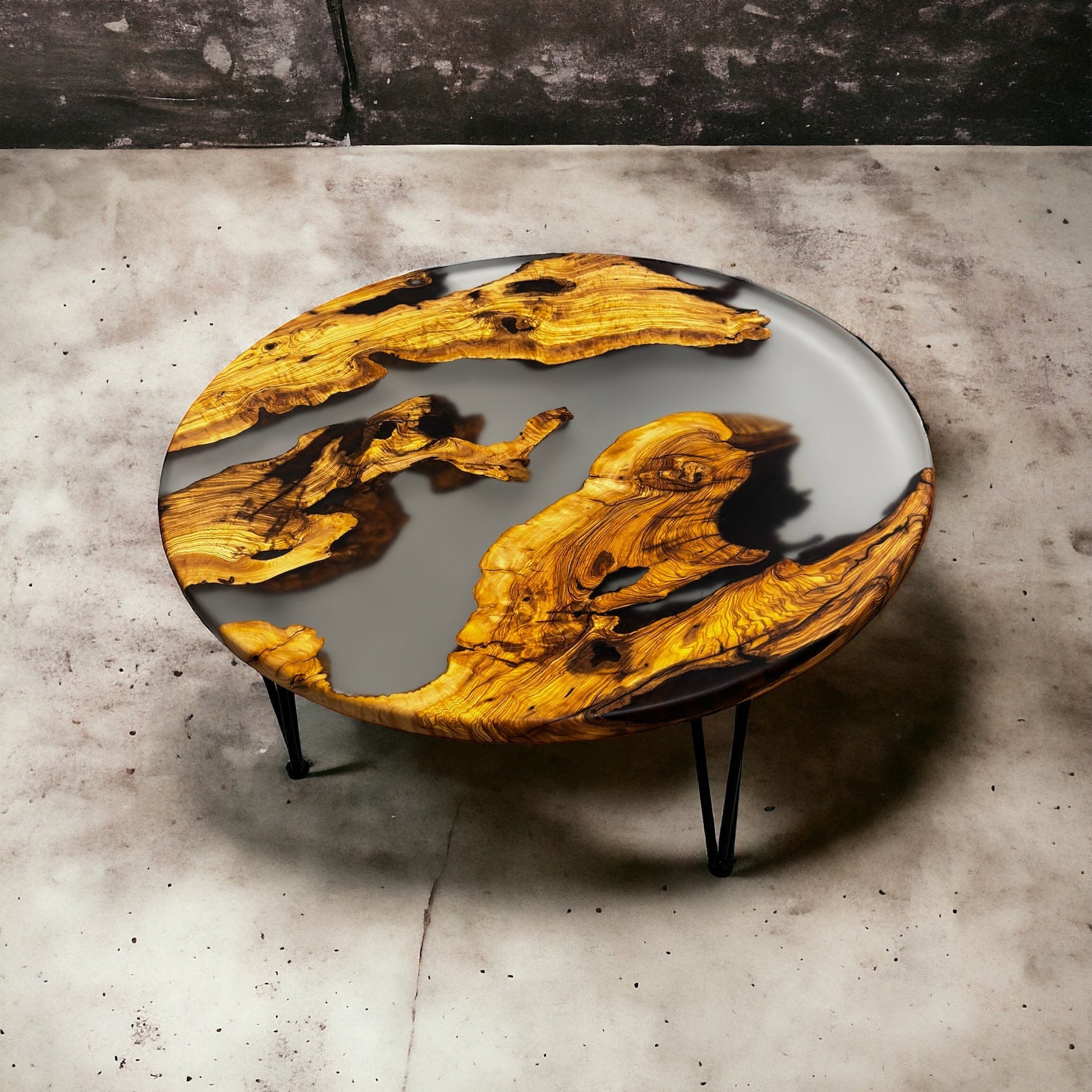 Unser exquisiter Couchtisch aus Olivenholz und transparentem, matt geschliffenem Epoxidharz bietet eine harmonische Fusion von Natur und modernem Design. Mit einem großzügigen Durchmesser von 86 cm schafft er eine eindrucksvolle Präsenz im Raum und wird zum Mittelpunkt Ihres Wohnzimmers.