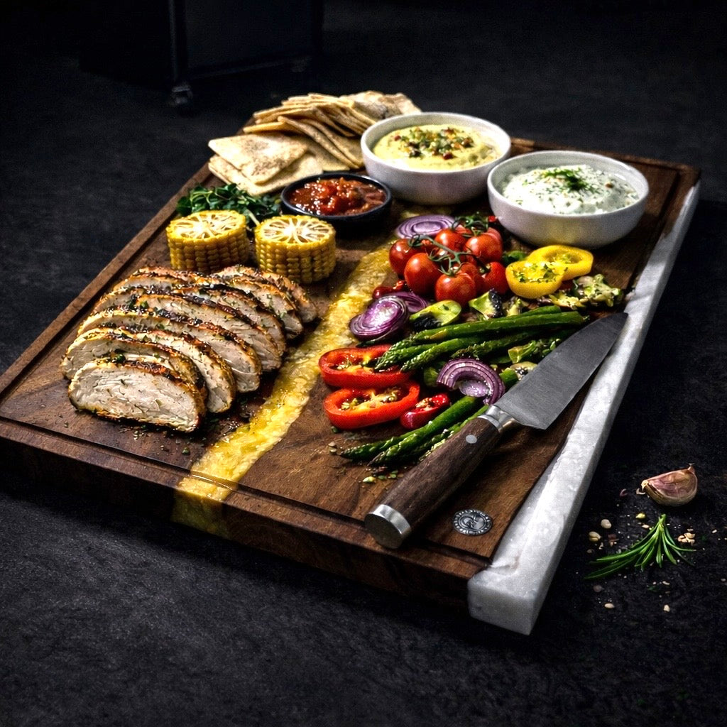 Dieses Premium Schneidebrett aus massivem Nussbaum vereint zeitlose Eleganz mit höchster Funktionalität. Der einzigartige Champagnergold-Fluss und die präzise gearbeitete Kante aus weißem Epoxidharz machen jedes Brett zu einem exklusiven Kunstwerk für Ihre Küche.