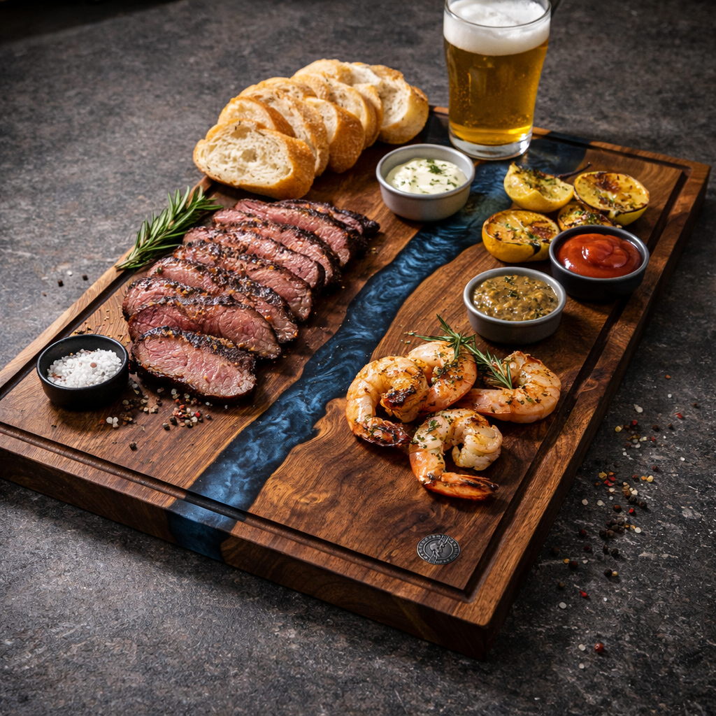 Dieses Premium Schneidebrett aus massivem Nussbaum vereint zeitlose Eleganz mit höchster Funktionalität. Der einzigartige blaue Epoxy-Fluss macht jedes Brett zu einem exklusiven Kunstwerk für Ihre Küche.