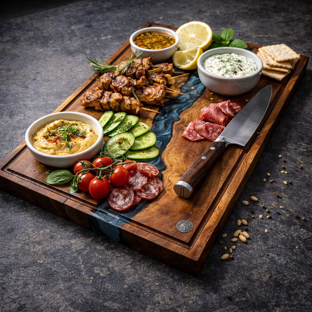 Dieses Premium Schneidebrett aus massivem Nussbaum vereint zeitlose Eleganz mit höchster Funktionalität. Der einzigartige blaue Epoxy-Fluss macht jedes Brett zu einem exklusiven Kunstwerk für Ihre Küche.