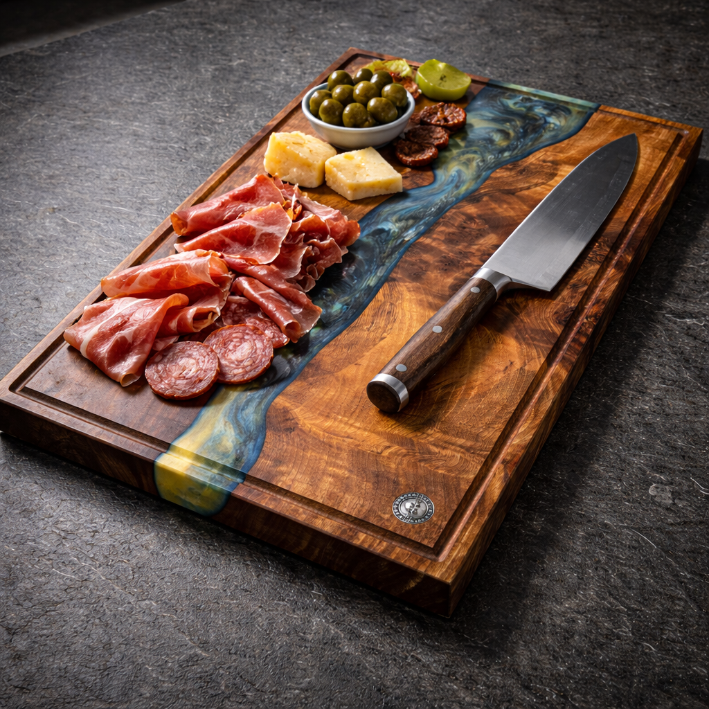 Dieses Premium Schneidebrett aus massivem Nussbaum vereint zeitlose Eleganz mit höchster Funktionalität. Der einzigartige Epoxy-Fluss in Gelb und Blau macht jedes Brett zu einem exklusiven Kunstwerk für Ihre Küche.